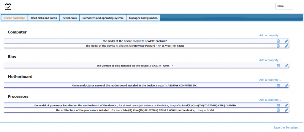 This menu allows you to create compliance templates for your devices groups. These templates are a list of properties that your devices must follow to be tagged as compliant. The compliancy of a device is renewed every time its inventory is refreshed.